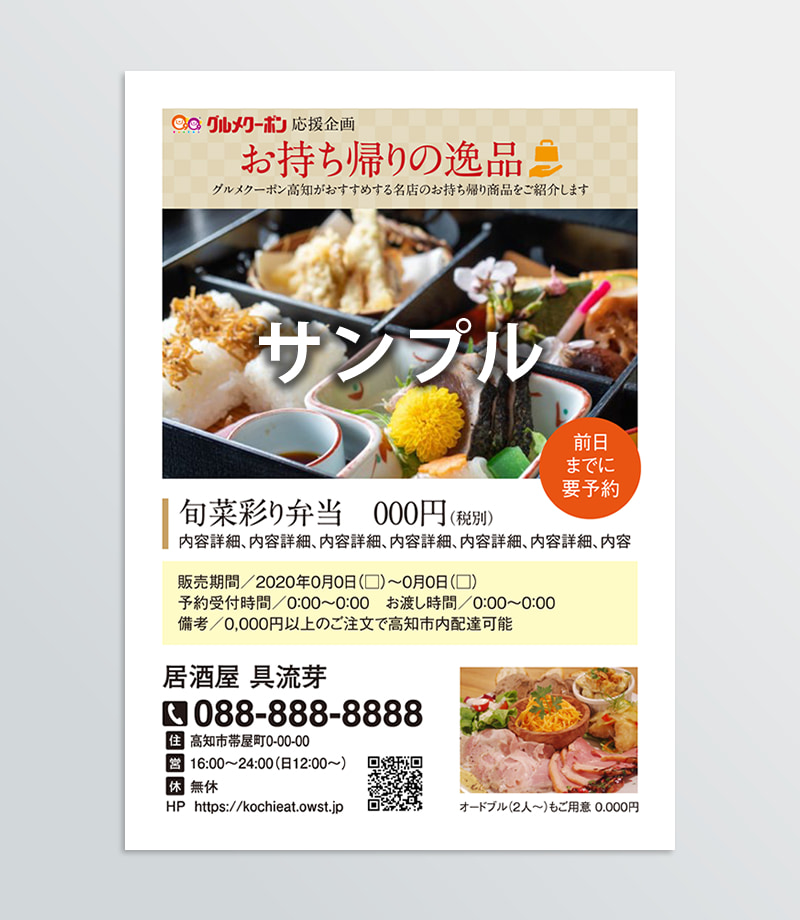 弊社では日頃、グルメクーポン高知をご愛顧いただいている飲食店への応援企画として、テイクアウト&デリバリーなどの集客用チラシを無償で提供しました。